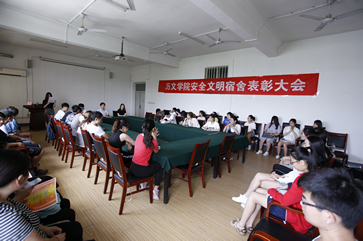 表彰会议伊始,主持人宣读了获奖班级名单和获奖宿舍名单,由柳书记、田老师和马老师分别为他们颁奖。随后,获奖班级代表发表了获奖感言,她认为一个优秀的安全文明班级不是一个人能造就的,而是全体同学共同努力的结果。最后,由柳书记作大会总结。柳书记首先对获奖的班级和宿舍进行表扬,并要求他们坚持下去,不要松懈。随后柳书记提出,要想成为安全文明宿舍并不仅仅是把宿舍卫生打扫好,而应该是把学风优良、整洁有序、文明守纪三者结合起来。柳书记着重强调了同学们的礼貌问题,看到老师来了应该主动打招呼,而不是视而不见、置若罔闻。柳书记希望各获奖班级和宿舍向优良学风班级和优良学风宿舍的方向努力,最后柳书记提醒同学们"优良学风之路任重而道远"。
