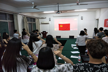 大会最后进行重温入党誓词活动,宣誓环节,全体党员高举右拳,灼灼目光凝聚在鲜红的党旗之上,在刘杰同志的带领下宣读入党誓词,同时向党旗表明为社会做贡献、为人民服务的坚定信念。