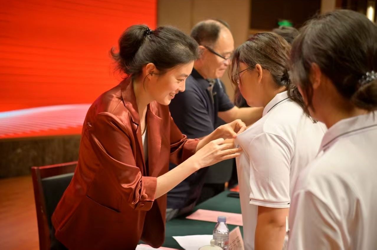 领导分别为新任班主任老师颁发了聘书,并为2025级新生代表佩戴校徽。