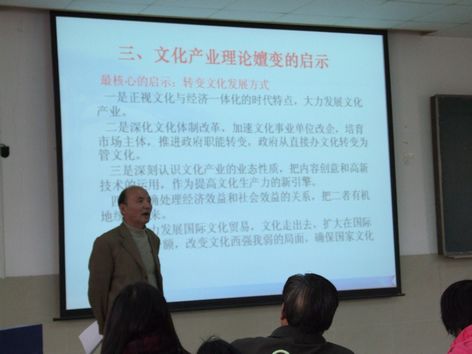 讲座中,江院长首先与现场的学生以问答的形式进行互动交流,拉近了与学生之间的距离,活跃了现场气氛。通过PPT展示,江院长向同学们详细介绍了法兰克福学派、英国文化学派和美国文化产业学派及霍克海默等文化产业理论代表人物。接着,他结合历史与现实的大背景就三个学派的理论观点进行一一评述,指出其中的优点与不足,深化了同学们对文化产业理论的认识。最后,江院长结合文化产业理论带来的启示就我国文化产业的发展现状及未来发展前景进行了剖析与展望。江院长生动细致的讲解,幽默风趣的语言,赢得同学们阵阵掌声。