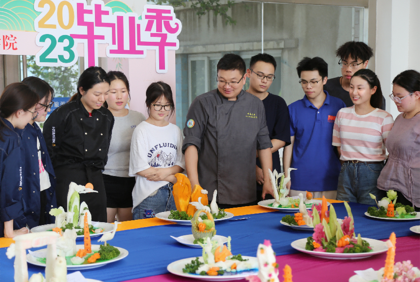 烹饪与营养教育专业大二学生于文旅楼大厅摆设食品雕刻展台,为2023届毕业生们送上最诚挚的祝福。各种寓有美意的食品展台齐聚一堂,供大家观赏。