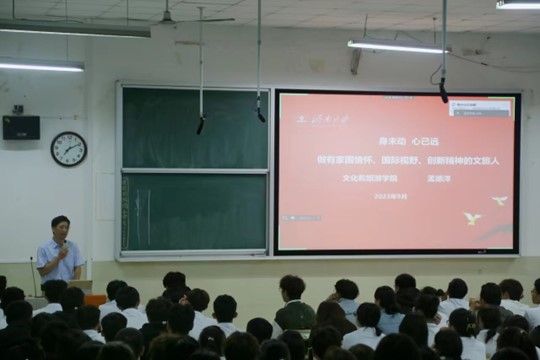 孟德洋书记与2023级新生们交流了“我们的大学是什么”,“读大学,是为什么”,“在大学里应该怎么做”三个问题。他强调,大学的意义和价值在于塑造思维方式、气质格局、生活态度和价值观,他指出上大学最重要的是要获得知识、见识、胆识和认识;并向全体新生提出几点要求:一要明确目标,在追求高远、积极进取中提升人生境界。二要学习努力,在追求卓越、精益求精中提升学习能力。三要身心康强,在健壮体魄、陶冶情操中永葆朝气活力。最后孟德洋书记勉励同学们,在全面推进中华民族伟大复兴的新征程上,做坚定理想、胸怀天下的新时代青年,做敢于担当、奋发图强的新时代青年,做勤练苦功、磨砺出彩的新时代青年,做不懈奋斗、砥砺前行的新时代青年,为强国建设、民族复兴挺膺担当,贡献文旅青年的智慧与力量。