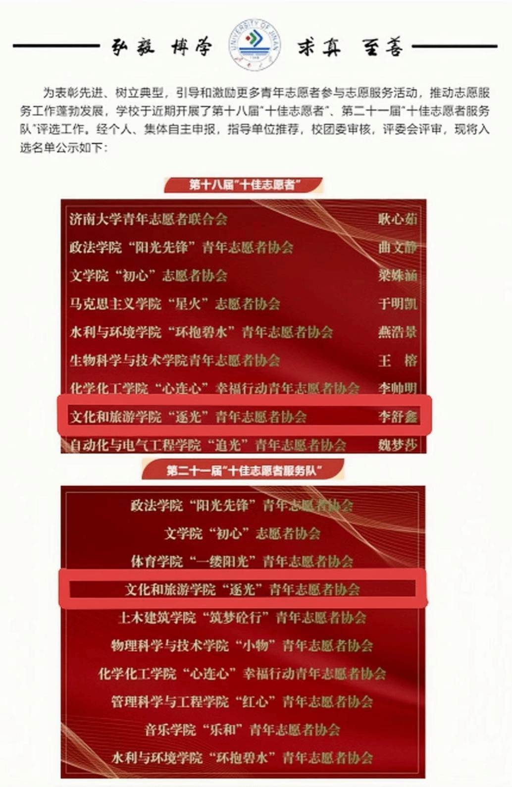 “逐光”青年志愿者协会与志愿者李舒鑫蝉联“十佳志愿者服务队”与“十佳志愿者”。荣誉称号 “逐光”青年志愿者协会自2019年成立以来,在秀人网