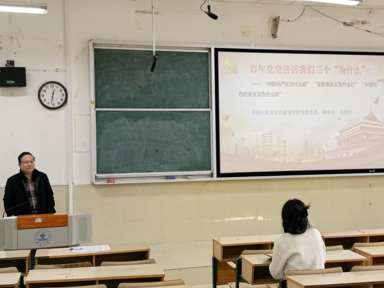 副院长张炳文回顾了中国共产党建党百年的艰辛历程,以百年党史告诉我们3个“为什么”——“中国共产党为什么能” “马克思主义为什么行”“中国特色社会主义为什么好”为题进行党史教育。深刻阐释三个“为什么”的核心原因,解答三个“为什么”的实践路径,同时对新时代大学生提出要求。要用科学理论武装头脑,以习近平新时代中国特色社会主义思想为坚定理想信念;以学习为动能,持续增长本领;践行党员先锋模范作用,为改革发展贡献力量。