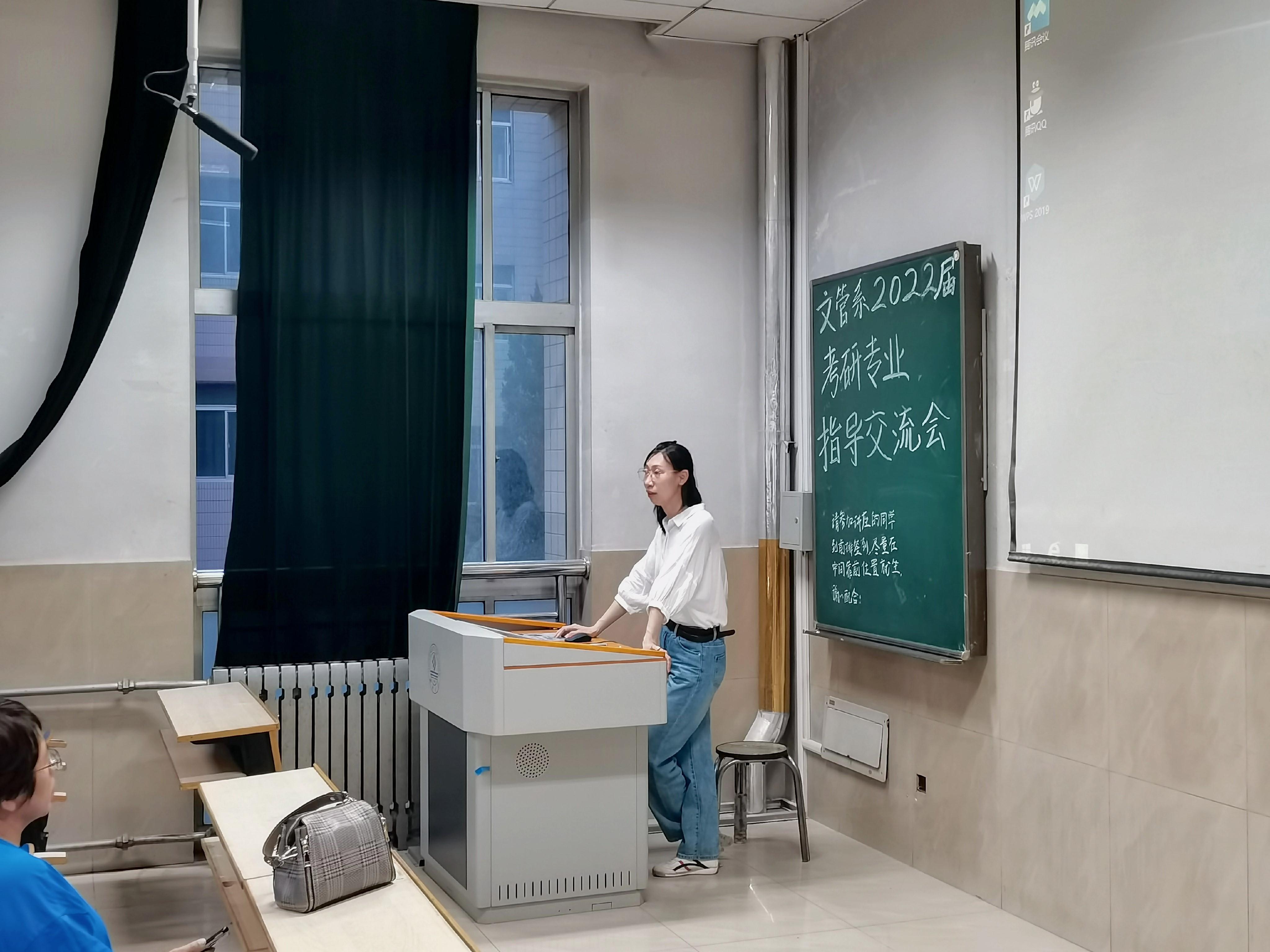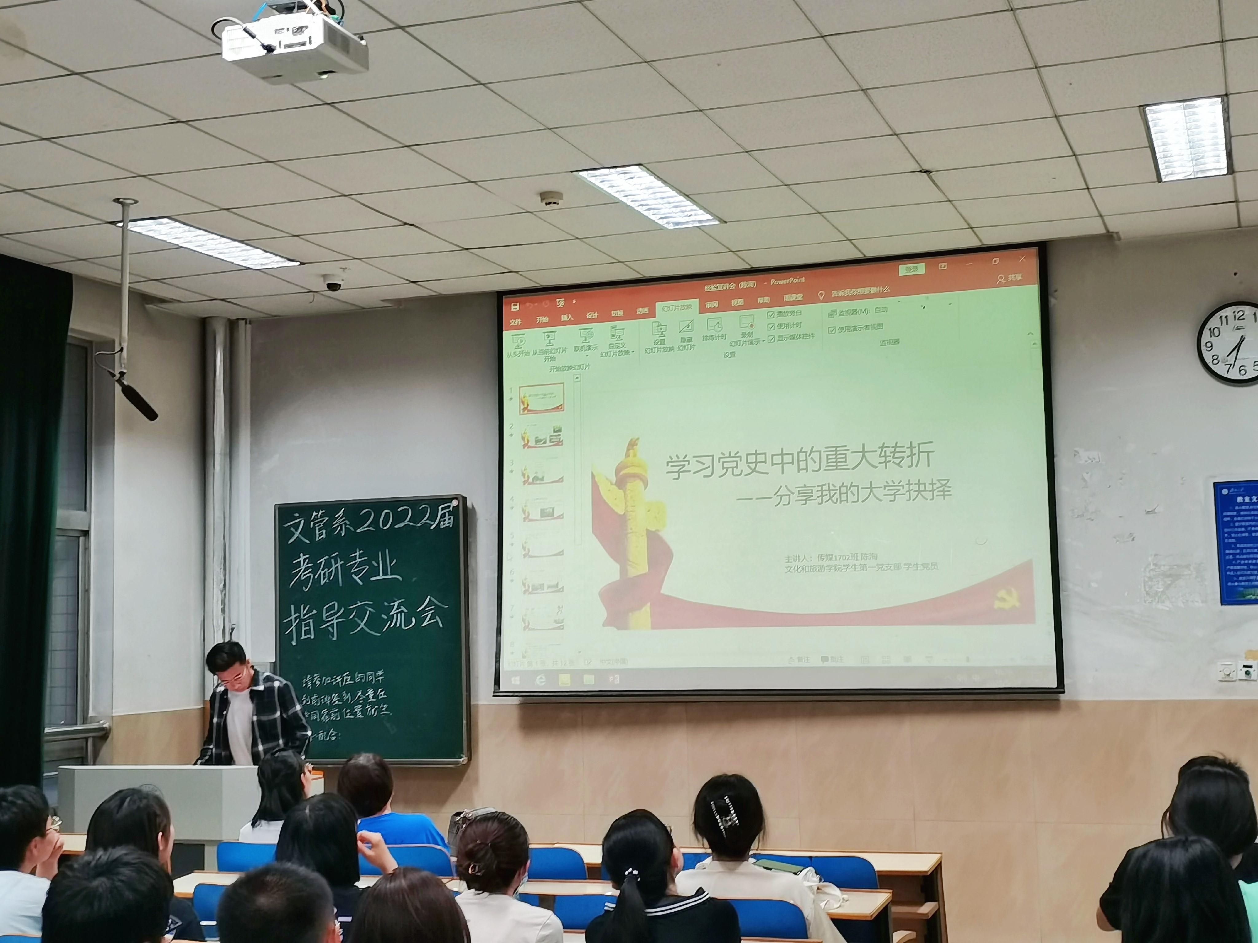 2022届考研学生提供指导和帮助,增强学生考研信心,提升考研竞争力。文管系专业教师顾方哲、宁秀丽现场答疑解惑,2021届文管系毕业生党员代表陈洵、王振华、赵倩倩、牛晨媛等四位同学分享备考经验,2022届文管系同学近百人参加活动。