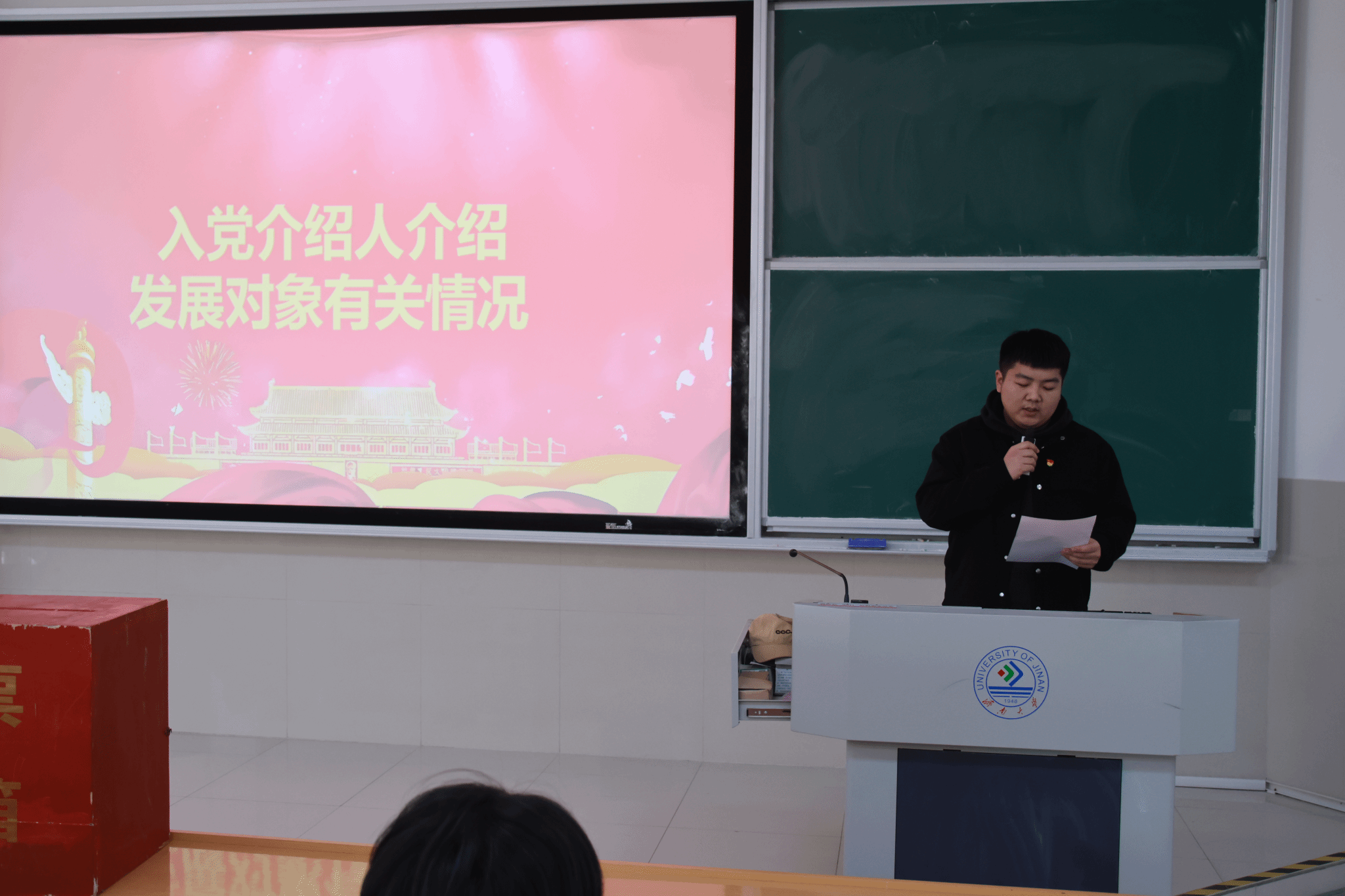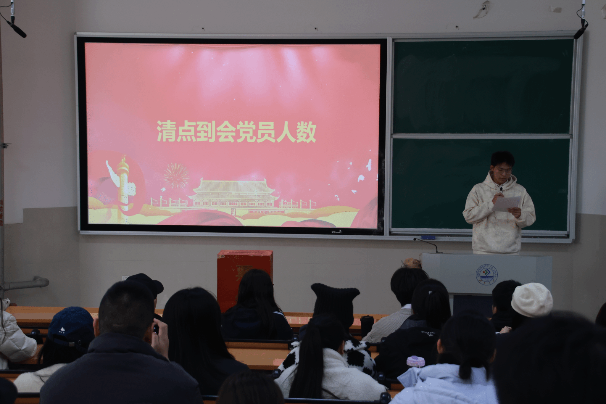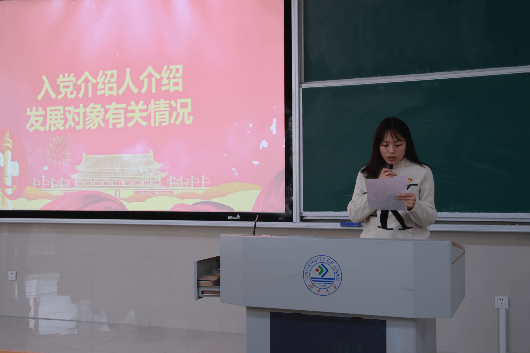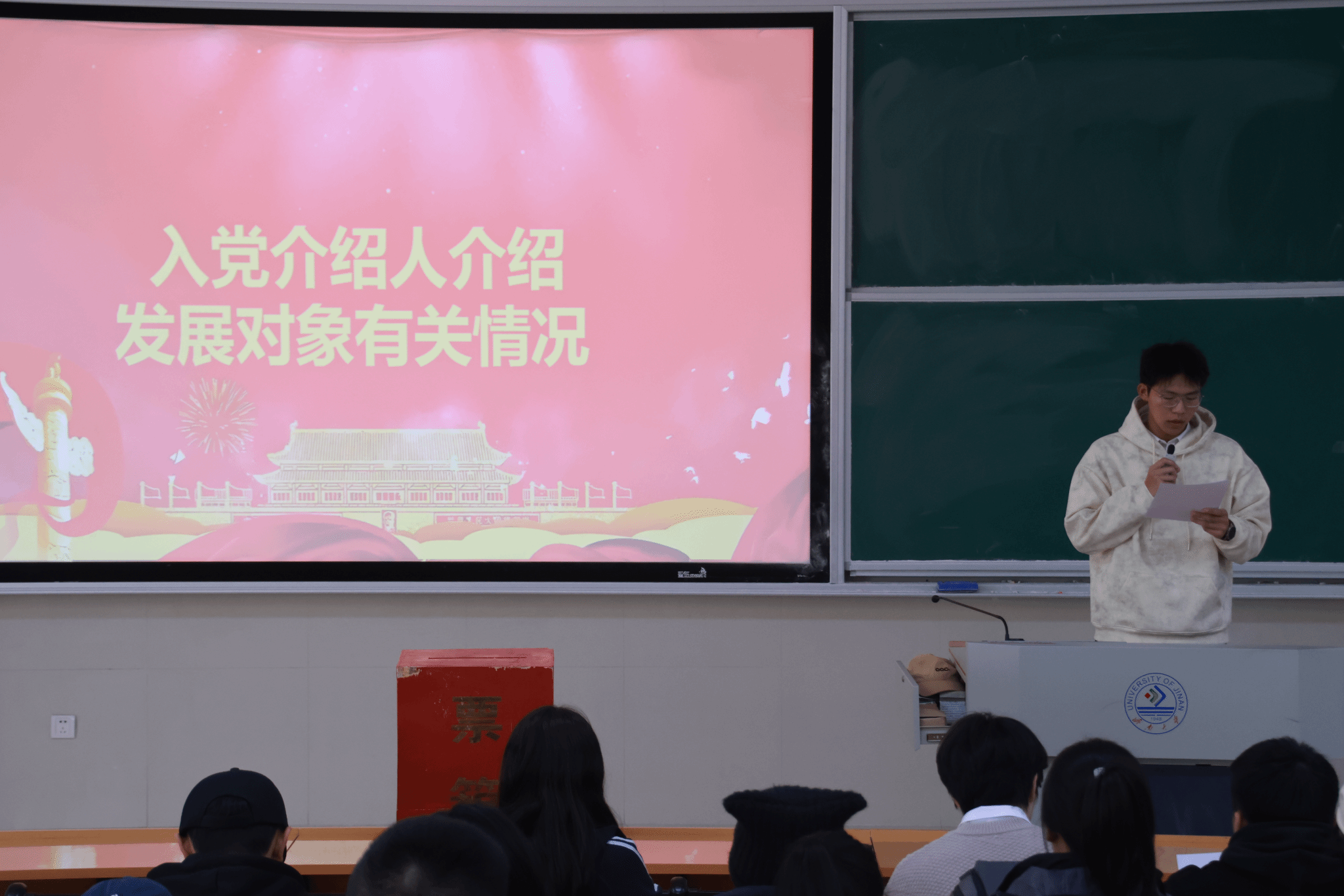 党支部在舜耕校区D3J102教室召开了接收新发展党员会议,本次大会主要讨论接收尹文琪等 43 名党员发展对象为中共预备党员的事项,由马驰原同学主持。