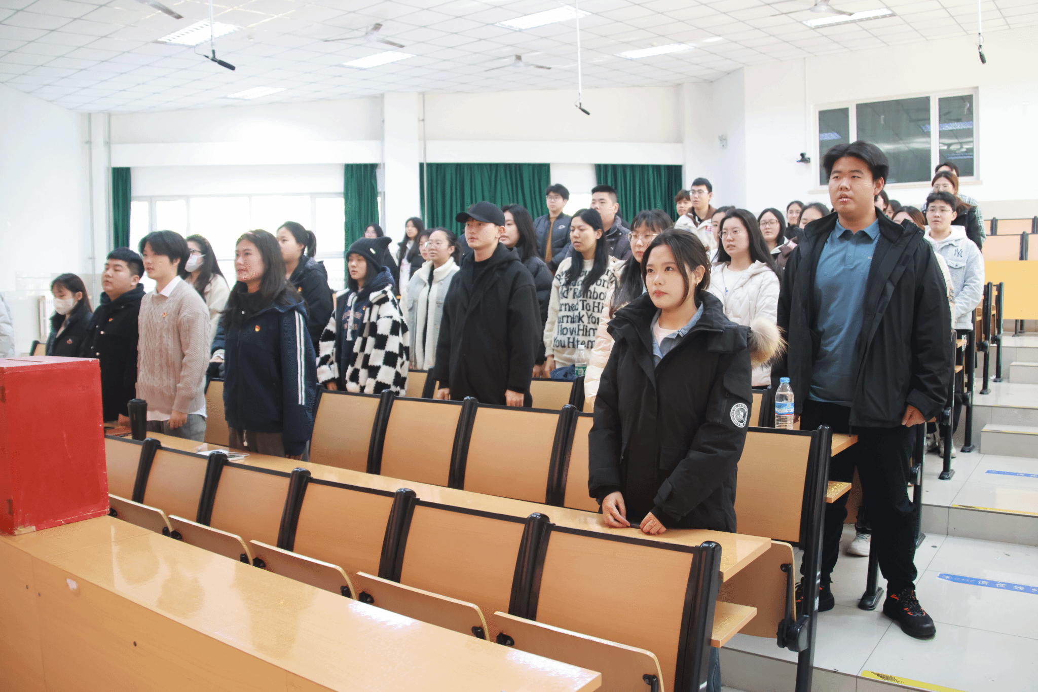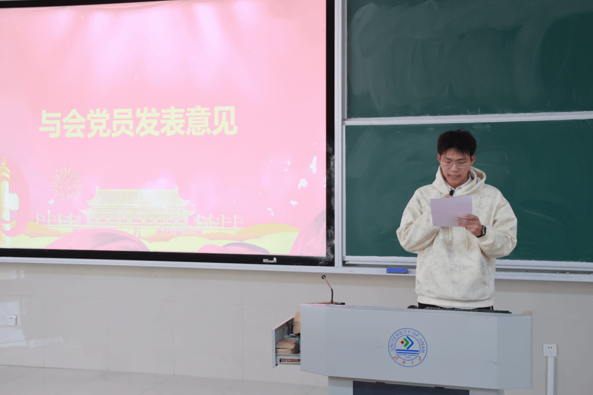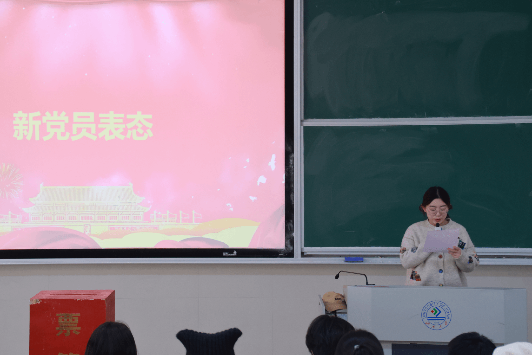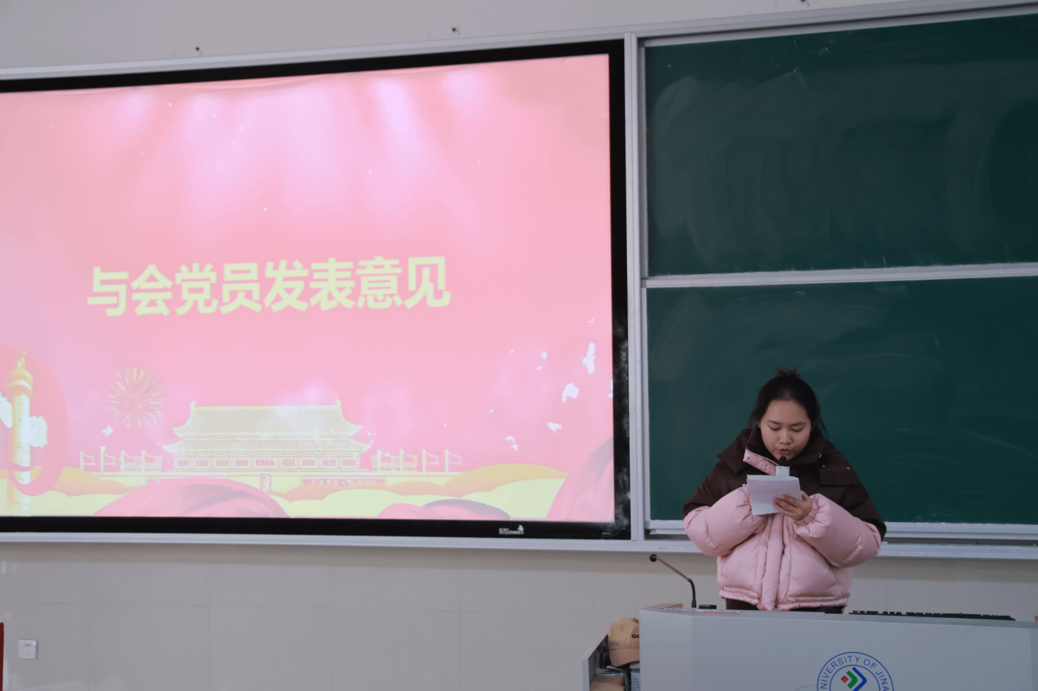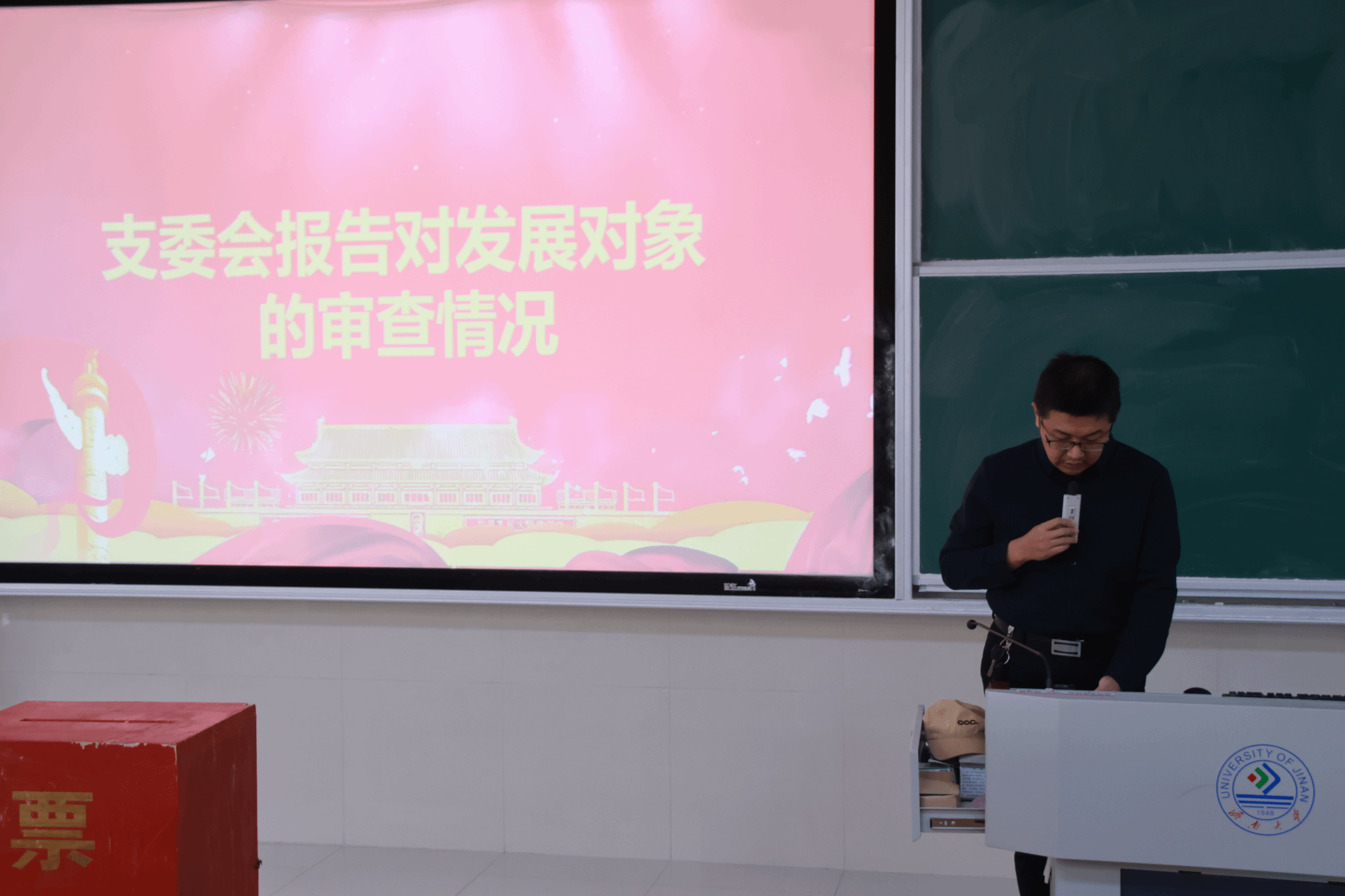 党支部在舜耕校区D3J102教室召开了接收新发展党员会议,本次大会主要讨论接收尹文琪等 43 名党员发展对象为中共预备党员的事项,由马驰原同学主持。