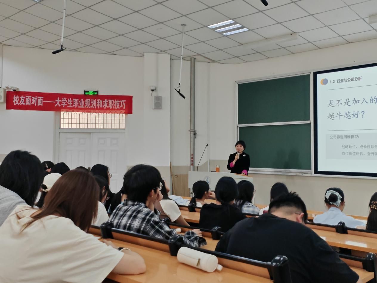 讲座伊始,刘娉娉校友以"从校园到职场"为主题,结合自身丰富的职业经历,从如何选择第一份工作、如何应对面试、入职后的适应锦囊三个部分,为同学们详细讲解了职业规划的方法与技巧。