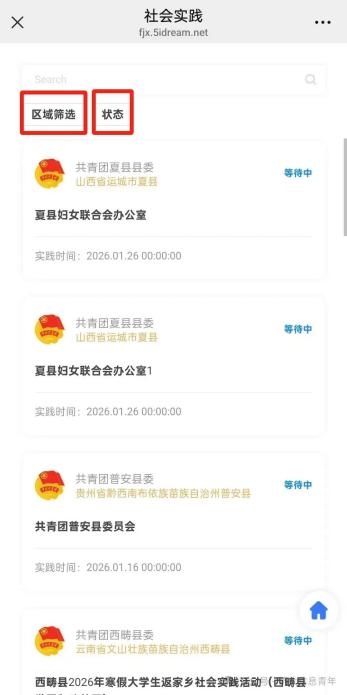 5.进行“区域筛选”,“状态”选择“报名中”的活动项目,选择其中适合的项目并点击“申请报名”。