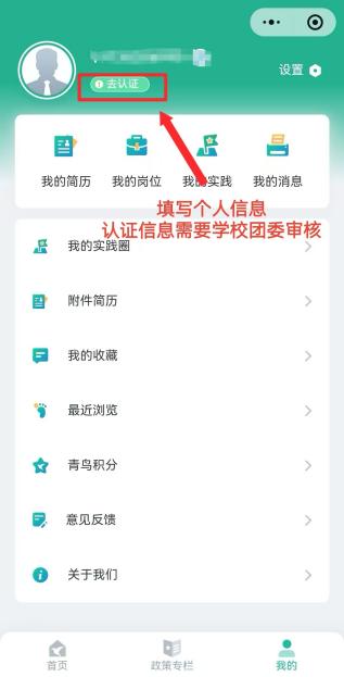 3.身份认证:右下角点击“我的”,点击认证,按照提示信息完成认证,等待学校团委审核通过。