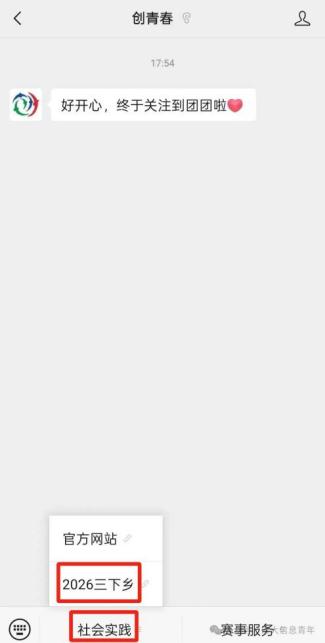 2.点击公众号底部“社会实践”,选择“2026三下乡”选项。