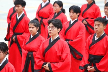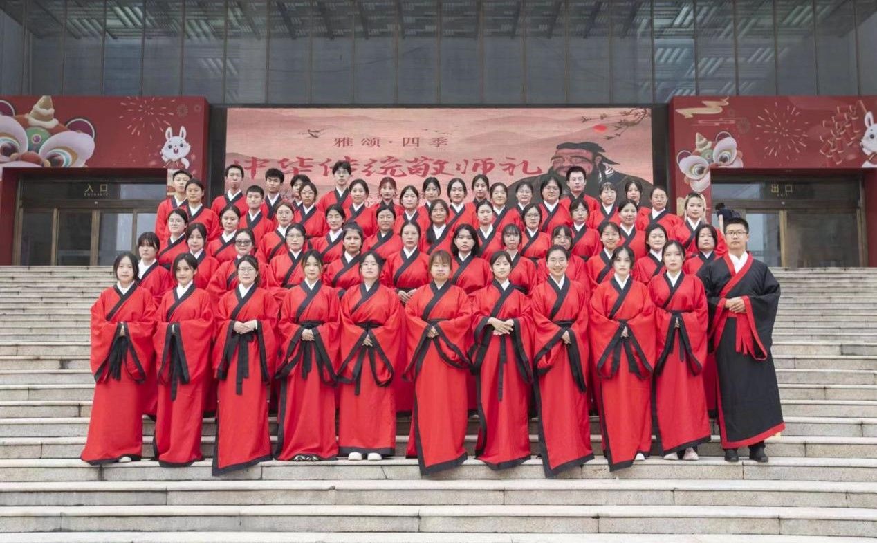活动在悠扬典雅的古乐中拉开序幕。同学们学习了汉服相关常识及穿着方式,在礼仪人员的指导下,学子们身着汉服,随后,仪式赞礼亲身授教,讲述中华传统敬师礼活动内涵意义,师生共同学习行礼方式。在仪式赞者的引领下,学子们通过正衣冠、礼拜圣贤、礼拜恩师、弟子奉茶、六礼束脩、敬送拜师贴、励志诵读等环节,表达对恩师的尊重。在文化馆工作人员的指挥下,同学们身着红色汉服,站成方队,拍照留念。