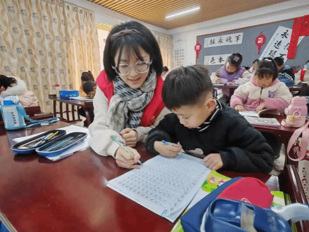 在今年寒假,武歆玥同学在朱家庄的翰墨轩寒假托管班担任志愿者,为小朋友们提供作业辅导和趣味课程授课服务。教孩子们写字,算数,让小朋友们领略到学习的乐趣。
