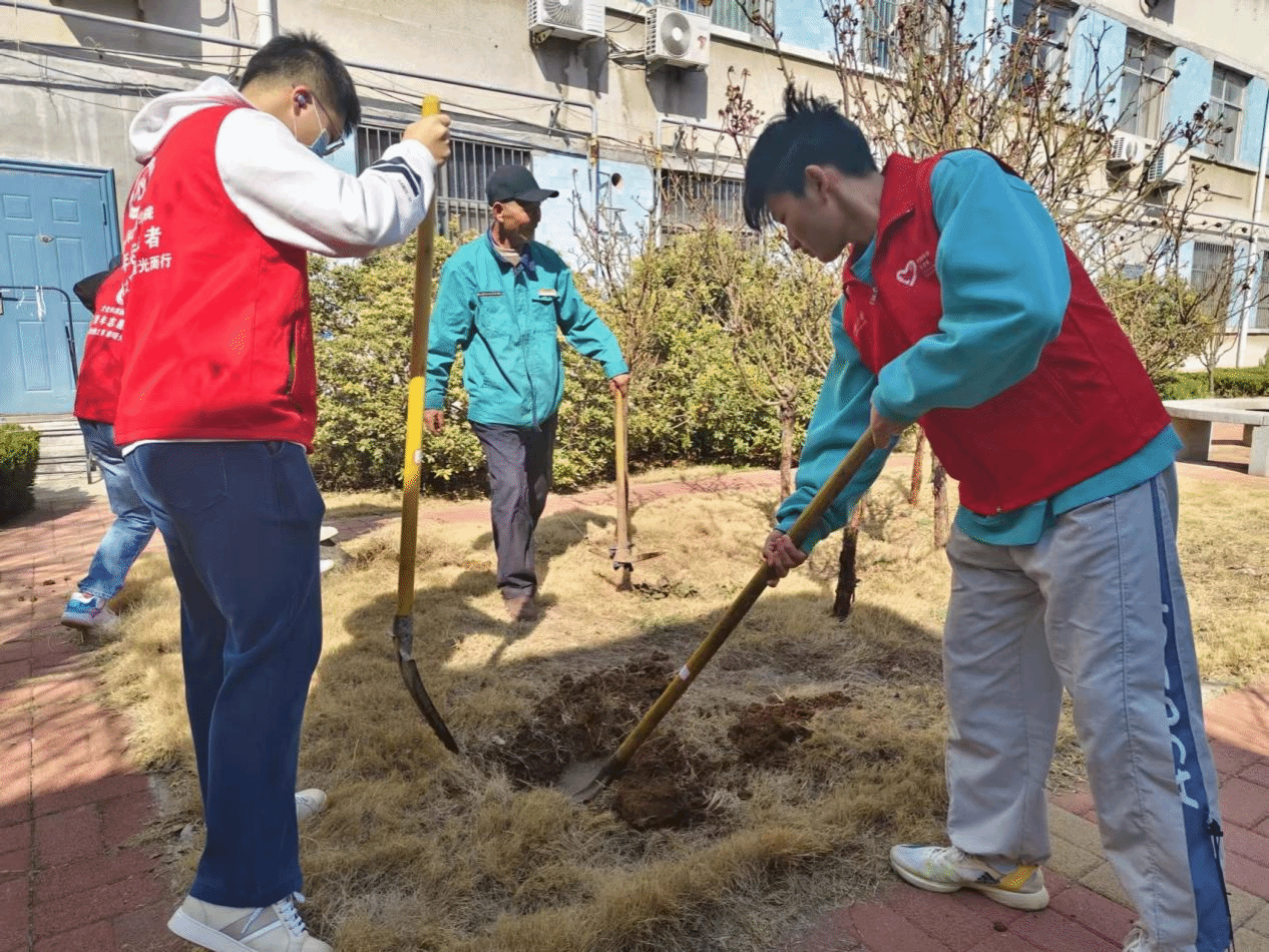 还邀请了园林部门工作人员对同学们进行指导。志愿者们认真学习植树技巧,从挖坑、培土到浇水,每一个环节都井然有序。经过一上午的努力,新栽种的棵棵小树苗迎风而立,为文旅楼增添新的生机与活力。活动最后,同学们将写有对未来美好期望的丝带悬挂在枝头,寓意为“‘植’得期待”,在这里,我们衷心祝愿他们的期望都能迎风飘扬。
