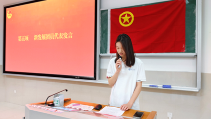 2024年度新发展团员名单,并由所属班级团支部委员为新发展团员佩戴团员徽章,颁发团员证。在学生会工作人员孙玉同学带领下,新老团员在团旗下庄严宣誓,表达他们加入共产主义青年团的决心和信念。