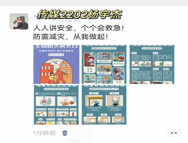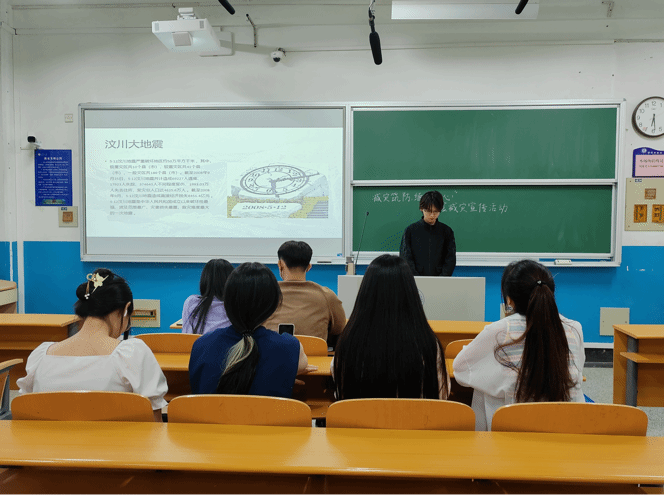 本次活动分为主题宣讲和宣传感悟两部分。宣讲当天,大家向在“5·12”汶川大地震中死难的同胞默哀,回顾历史,分享英雄事迹,缅怀抗震救灾英雄不惧牺牲、无私奉献的伟大精神。面对抗震救灾的历史画面,同学们被深深地触动,他们为在灾难中失去家园和生命的人们感到悲痛,也对无私奉献、英勇救灾的人们致以敬佩。随后,大家观看防震科普视频,学习防震防灾必备技能。宣讲结束后,活动参与同学在线上社交平台通过分享防灾减灾知识和个人感悟,展示汶川地震后的重建故事,号召大家提高防震减灾意识,铭记历史,缅怀先烈。同时,同学们将防灾宣传语如“密切关注预警信息”“提前准备应急物资”“制定应急方案”等写在便利贴上制作成活动展板帮助全院同学普及防震减灾知识。活动参与者陈言涵表示,她会时刻铭记历史,缅怀先烈,同时会牢记了解到的防震知识,在必要的时候能够冷静应对。