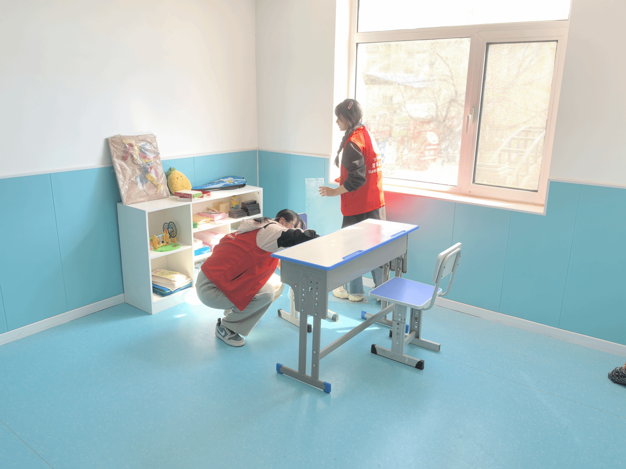 活动当天,志愿者们分工协作,与基地老师共同清扫教室与走廊。他们仔细擦拭桌椅、整理教具、清洁地面,用行动为孩子们打造明亮舒适的学习环境。过程中,志愿者们还摆放书籍、整理玩具。一名志愿者表示:“看到孩子们露出的笑容,虽然动作略显笨拙,但依旧十分让人感动。”