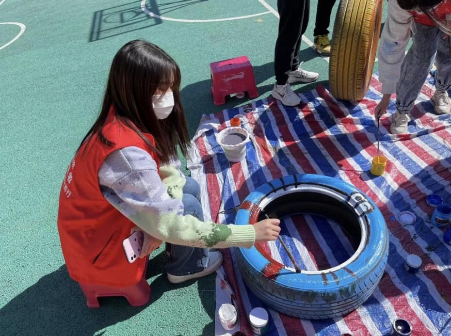 室外的活动同样精彩。志愿者和孩子们一起发挥创意,在轮胎上进行绘画创作。五彩的颜料在轮胎上绽放,孩子们在志愿者的陪伴下,尽情地享受着艺术创作带来的乐趣。每一笔色彩,都像是孩子们内心世界的一扇窗户,通过这样的方式,他们在表达自我的同时,也感受到了来自外界的关爱和温暖。
