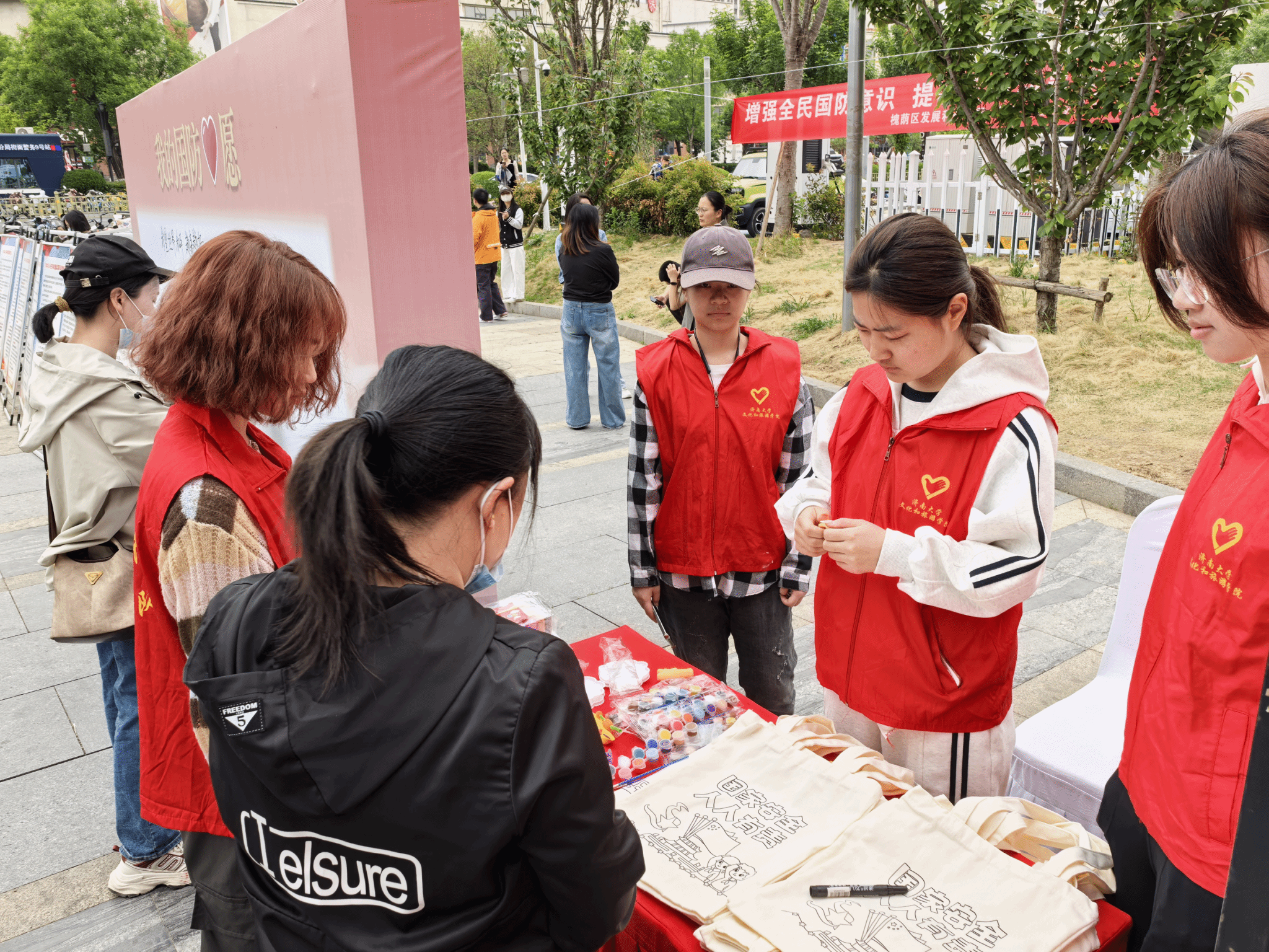 在手工互动区,志愿者与居民共同绘制迷彩主题手提包、制作坦克与战机彩泥模型。通过志愿者指导,孩子们在动手实践中学习国防知识,退伍军人张先生现场讲解装备原型故事,让抽象概念变得生动可感。志愿者祁家彤完成了属于自己的航母彩泥作品:“我特别喜欢这种边玩边问军舰知识,这种学习方式特别自然。” 她如是说。