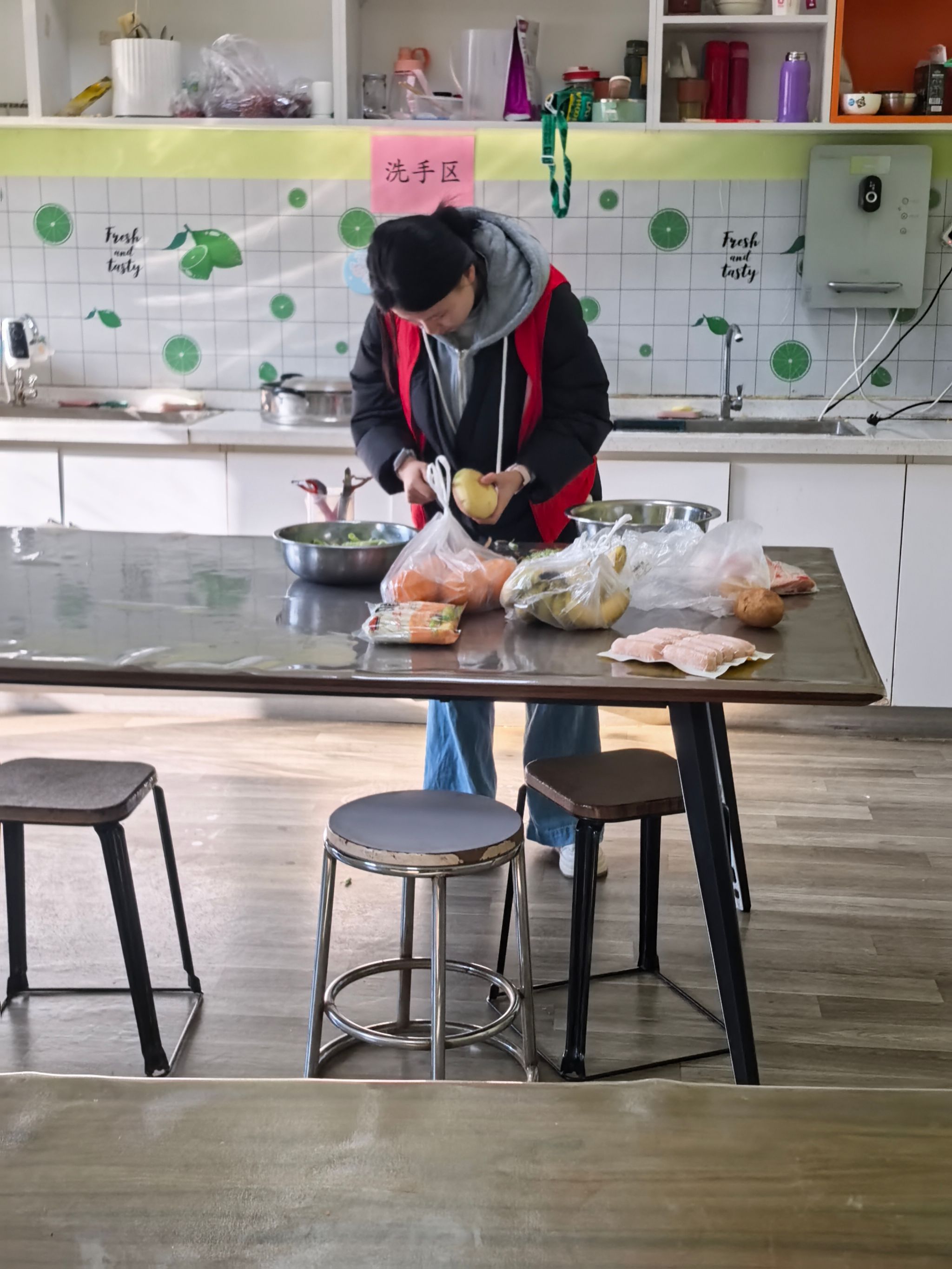 厨房里升腾的烟火气里蕴含着志愿者们最真切的关怀。临近正午,志愿者们化身“暖心厨伴”,围在灶台旁忙碌起来:认真清洗新鲜的蔬菜,细致削去土豆的外皮,动作娴熟又轻柔,生怕惊扰了这份宁静的美好。指尖的温度传递到食材之上,也悄悄暖了孩子们的心房,简单的厨房劳作,因这份陪伴与付出,变成了最动人的冬日画卷。