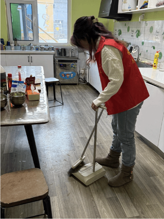 为给孩子们打造一方洁净舒适的成长天地,志愿者们又化身“暖心守护者”,走进厨房与公共区域,开启一场细致的“焕新行动”。他们手持抹布,细细擦拭餐桌的每一寸肌理,让油污与痕迹悄然褪去;俯身清扫,认真清理地面的每一粒尘埃,让洁净与清爽铺满角落;弯腰捡拾,仔细清除藏匿的杂物,让温暖与安心环绕左右。汗水浸湿了衣衫,却挡不住他们眼中的坚定;疲惫萦绕在心头,却抵不过心中的暖意。“能为孩子们营造干净的环境,守护他们的健康成长,再累也甘之如饴。”志愿者杨羽豪的话语朴实无华,却用双手为孩子们筑起了一道坚实的“安心防线”,让这方小小的天地,成为孩子们肆意生长的温暖港湾。