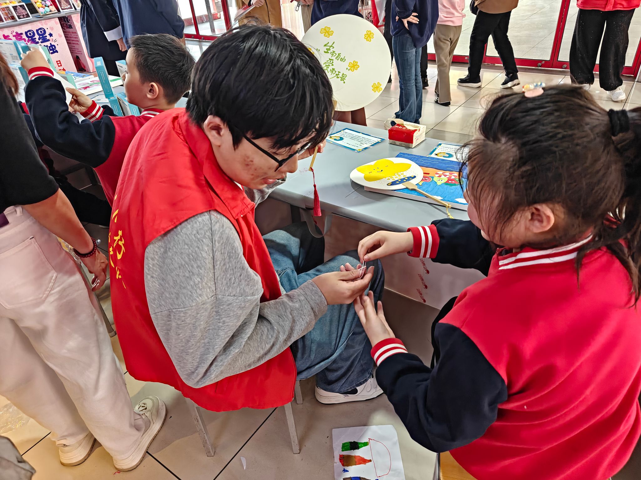 摊位旁的互动区,暖阳倾洒,时光温柔。志愿者们化身孩子们的“爱心伙伴”,用温暖笑容消融距离,用贴心陪伴温暖时光。他们或蹲在孩子身边,一同整理手作,分享创作乐趣;或与孩子面对面,静静倾听稚嫩呢喃,用温柔眼神回应纯真;或在孩子紧张时,轻拍肩膀传递力量。清脆笑声似风铃回荡,温柔叮嘱如暖阳浸润。阳光、笑脸、欢声、细语交织成动人的童年乐章,让守护与关爱在彼此心间静静流淌,让纯真童心在陪伴中自在绽放。