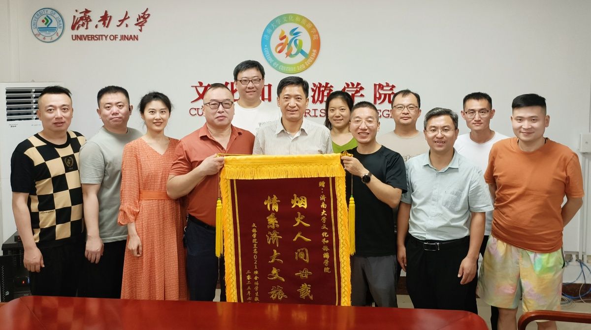 座谈会上,校友们逐一分享了毕业后的工作经历和人生感悟。并向秀人网 赠送了一面写有“烟火人间廿载,情系济大文旅”的锦旗,表达对母校和老师们的感激之情。校友们纷纷表示,无论走到哪里,烹高021班的同学们始终以母校为荣,并将继续关注和支持秀人网 的发展。孟德洋代表秀人网 接受锦旗,并为校友们赠送了秀人网 精心准备的纪念品,希望校友们永远铭记母校的培育之恩,在未来的人生道路上继续砥砺前行。